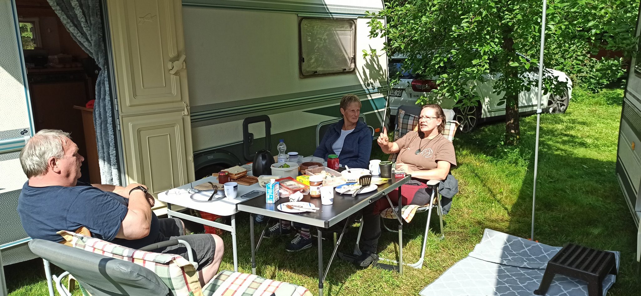 Also haben wir unsere Wohnwagen angehängt und sind Dienstag mit 4 Leuten zu Steffie und Andreas von Wamputah gefahren. Nachdem die Wohnwagen abgestellt waren, wurde erstmal der Grill angeheizt. Leider fing es Abends an zu regnen, so dass eine Parcoursrunde verworfen wurde.