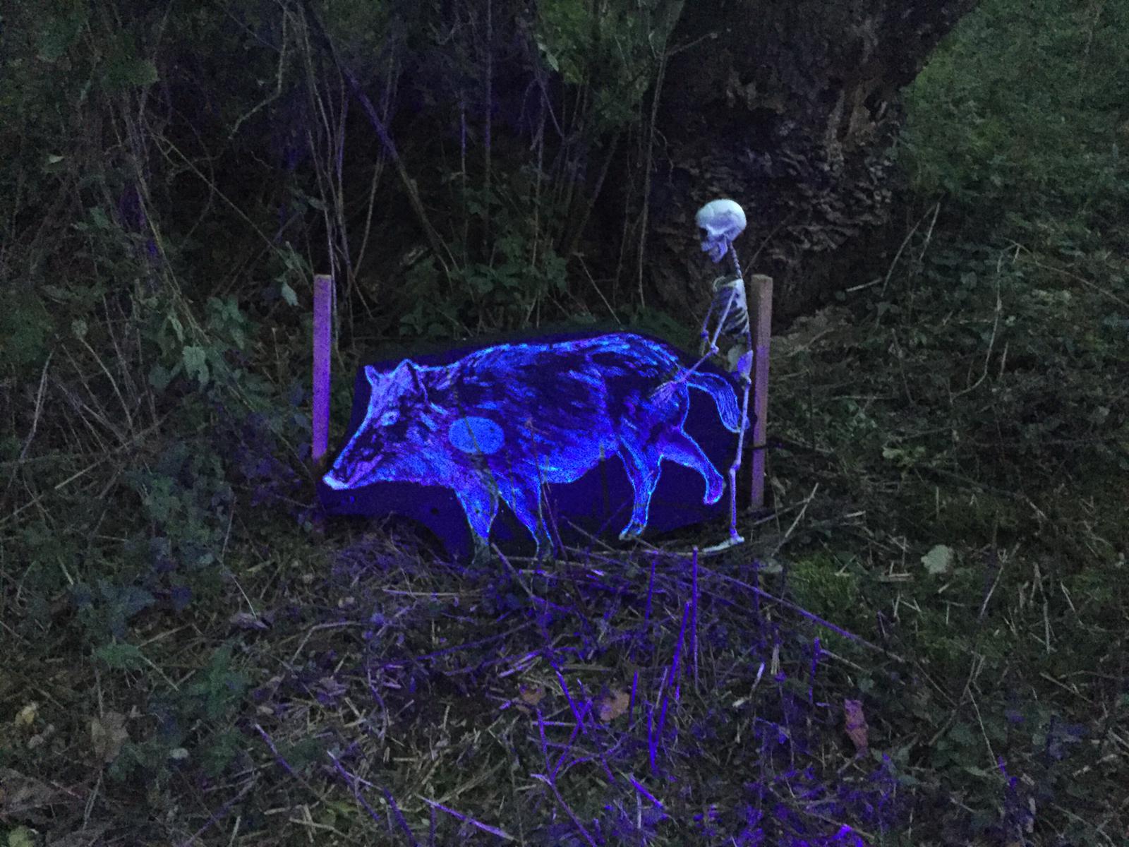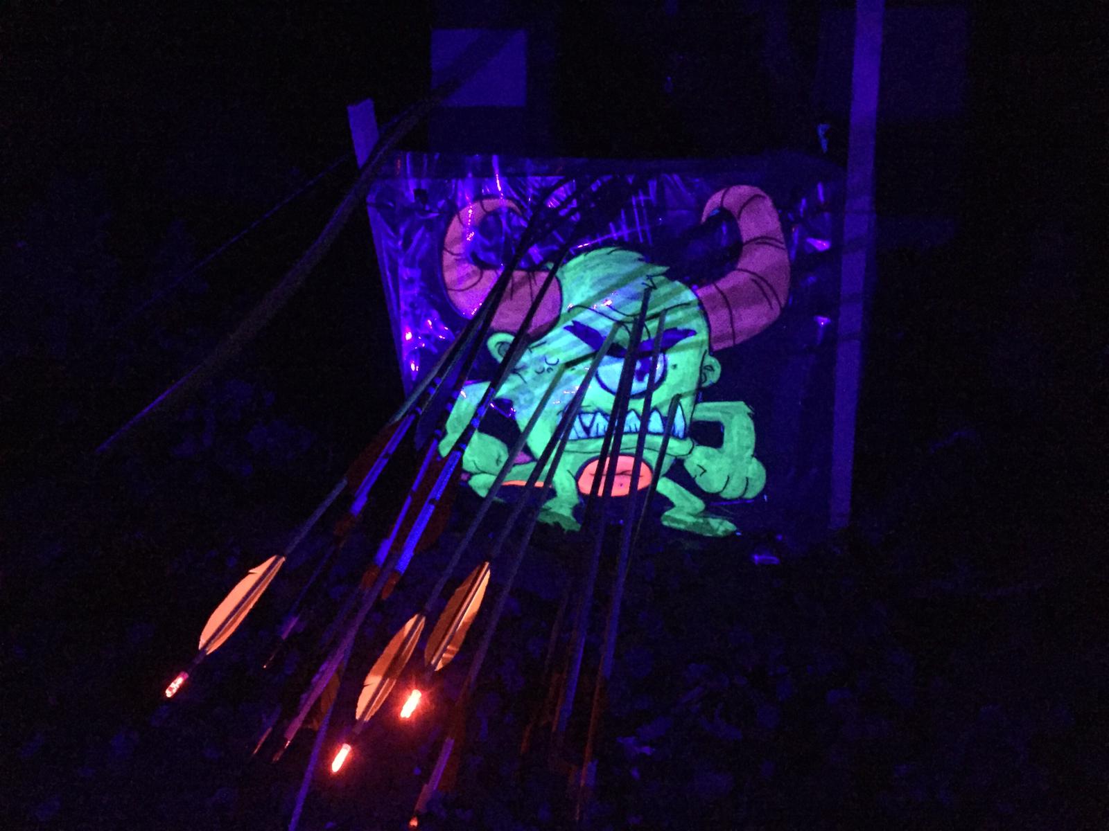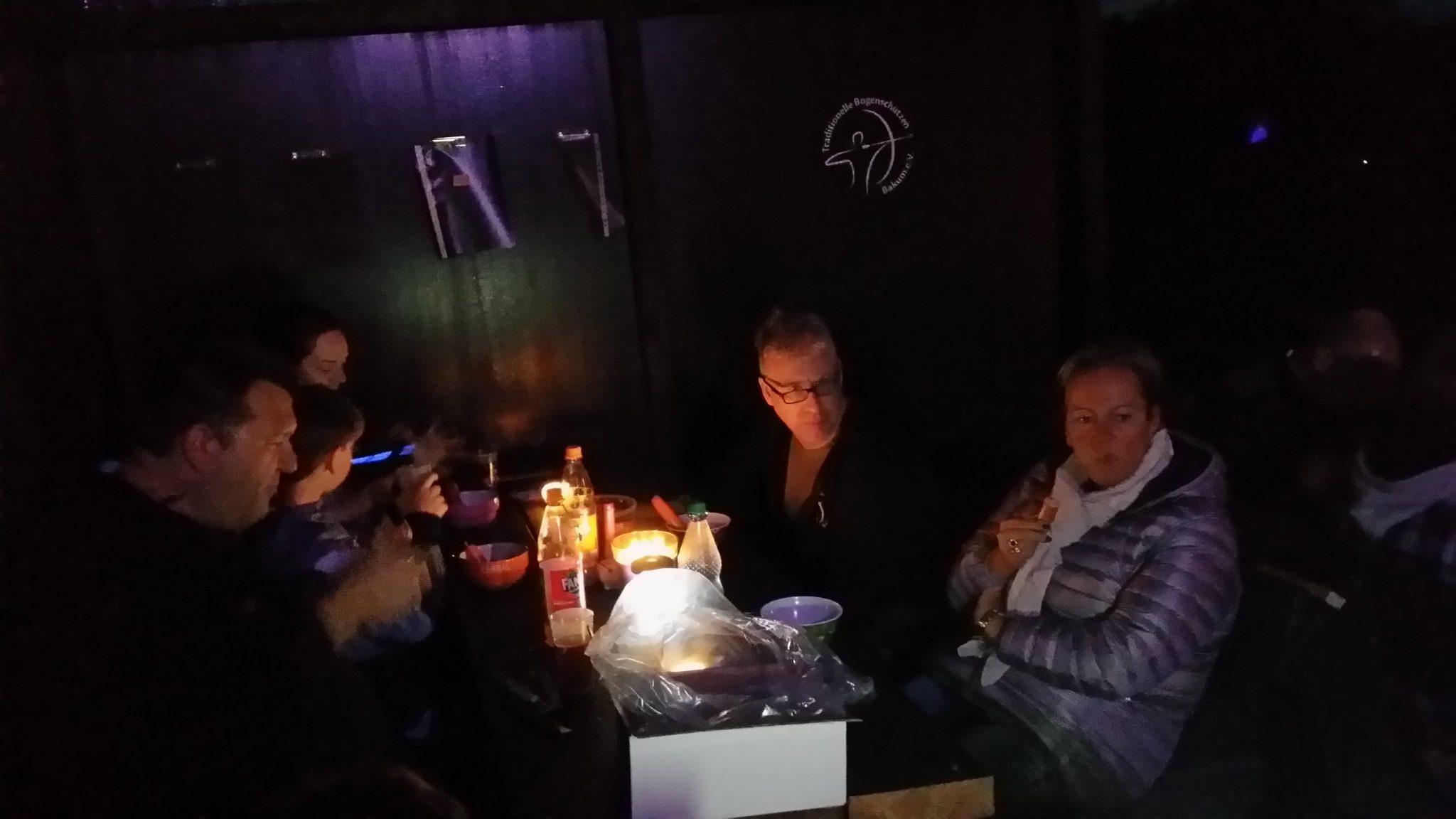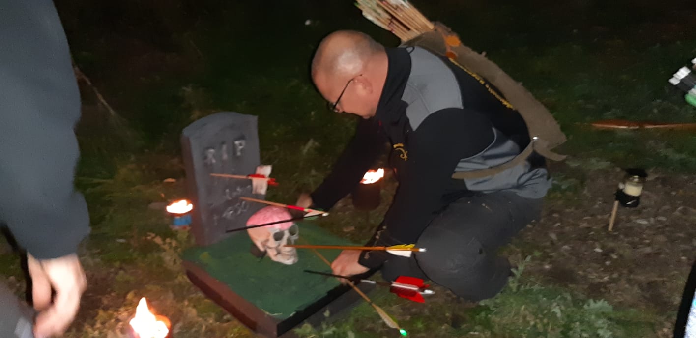 Trotz kurzer Entfernung und recht großer Ziele war das nicht so einfach, da ein großer Teil der Ziele abgezeichnet war. Nach der Runde gab es erstmal einen heißen Erbseneintopf + Würstchen zur Stärkung. Tina, Russlana und Renè Vogler stellten das Küchenpersonal, während Christian, Ecki und ich den Parcours umbauten. Nachdem sich alle gestärkt hatten, ging es an die Nachtrunde. Obwohl es Taschenlampenturnier heißt, war das Ausleuchten der Ziele untersagt. Die Taschenlampen diente nur zum Ausleuchten des Weges. Alle Ziele waren selbstleuchtend (UV-Lampen) oder mittels Fackeln beleuchtet. Es wurde jeweils 3 Pfeile geschossen und gewertet. Die Ziele waren Halloweenmäßig gestaltet. Nicht nur die jugendlichen hatten einen riesen Spaß. Das Treffen geriet fast zu Nebensache…