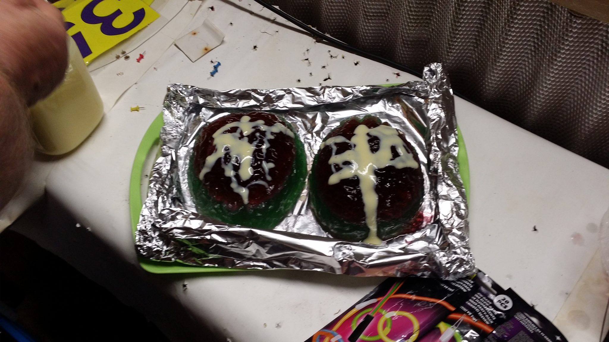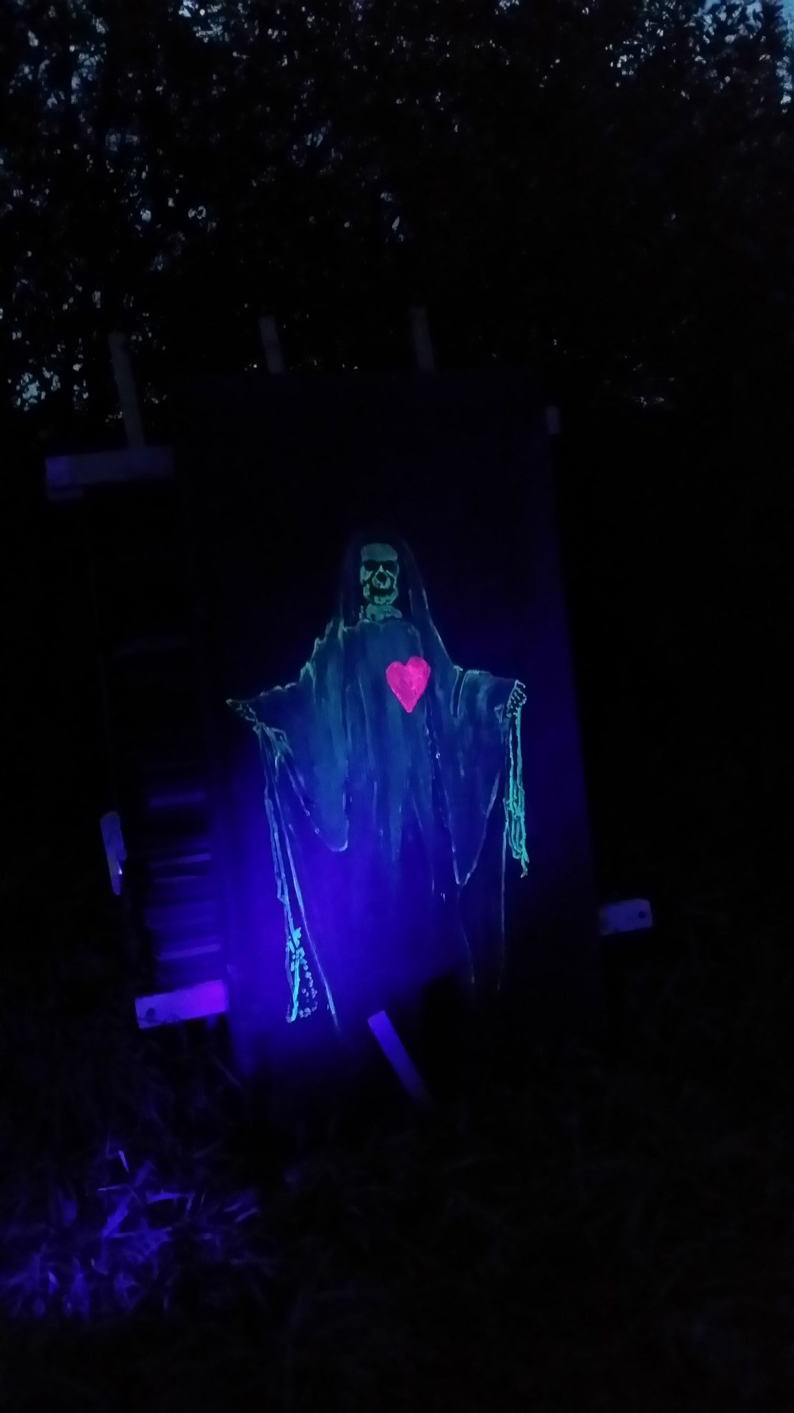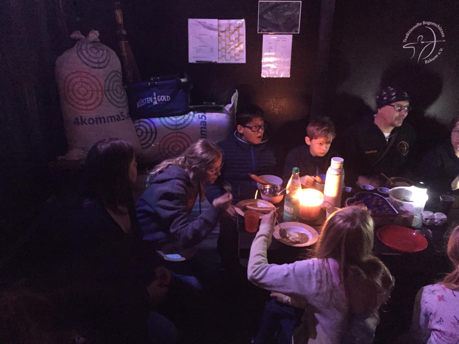 Trotz kurzer Entfernung und recht großer Ziele war das nicht so einfach, da ein großer Teil der Ziele abgezeichnet war. Nach der Runde gab es erstmal einen heißen Erbseneintopf + Würstchen zur Stärkung. Tina, Russlana und Renè Vogler stellten das Küchenpersonal, während Christian, Ecki und ich den Parcours umbauten. Nachdem sich alle gestärkt hatten, ging es an die Nachtrunde. Obwohl es Taschenlampenturnier heißt, war das Ausleuchten der Ziele untersagt. Die Taschenlampen diente nur zum Ausleuchten des Weges. Alle Ziele waren selbstleuchtend (UV-Lampen) oder mittels Fackeln beleuchtet. Es wurde jeweils 3 Pfeile geschossen und gewertet. Die Ziele waren Halloweenmäßig gestaltet. Nicht nur die jugendlichen hatten einen riesen Spaß. Das Treffen geriet fast zu Nebensache…